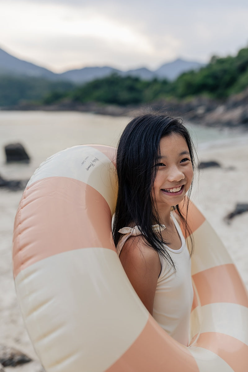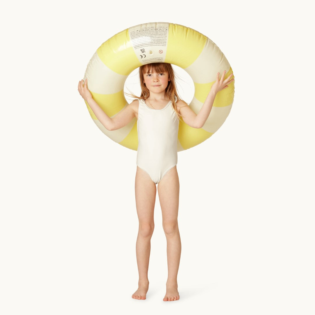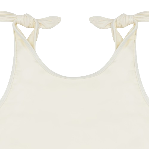 The cream-coloured contrast piping gives this style a timeless look that goes perfectly with our classic floats. Attached knot-bows on the shoulders adds a subtle feminine touch. Match with a tone-in-tone swim ring and swim goggles or mix your favourite colours for a beautiful complete look.