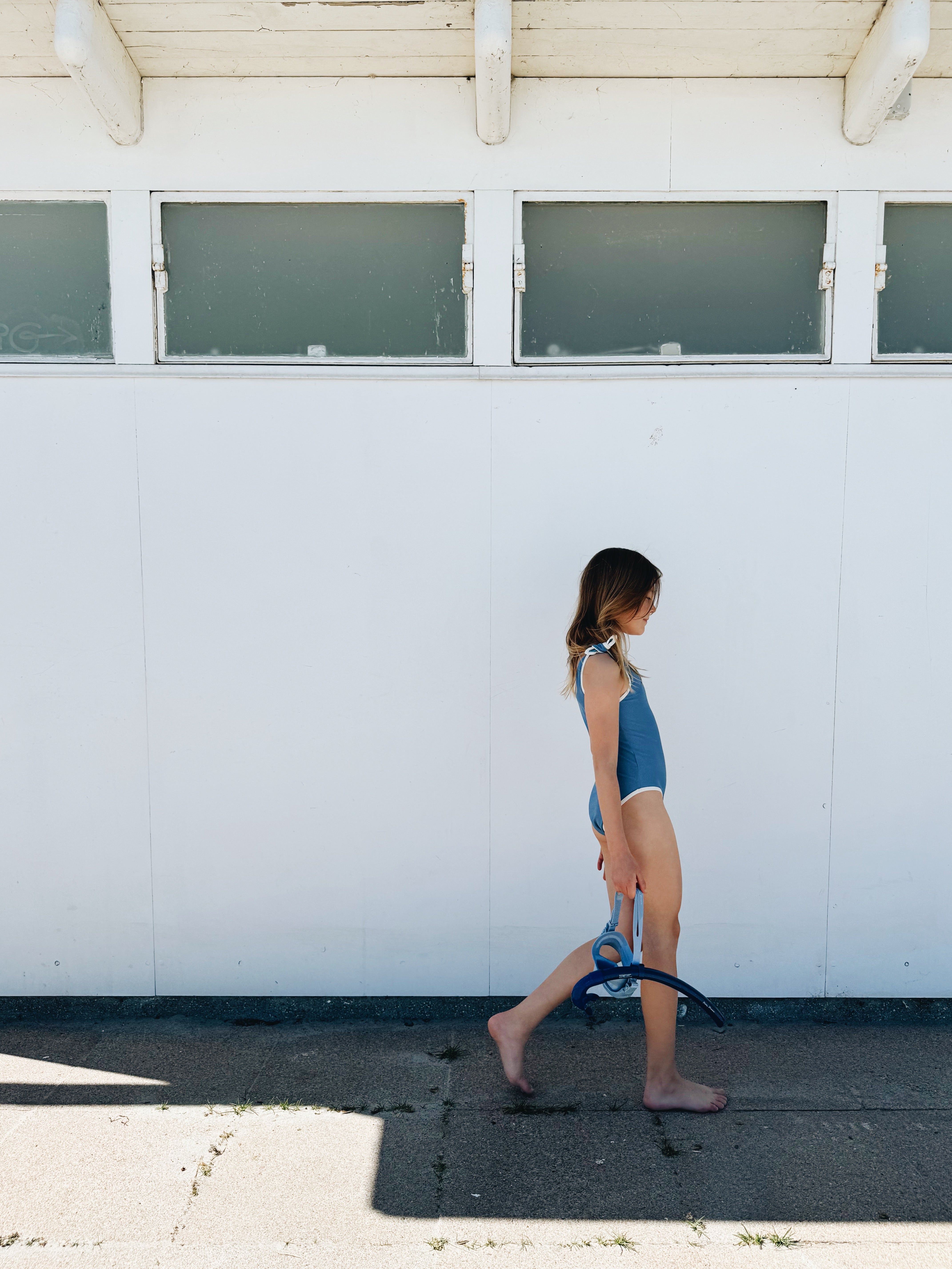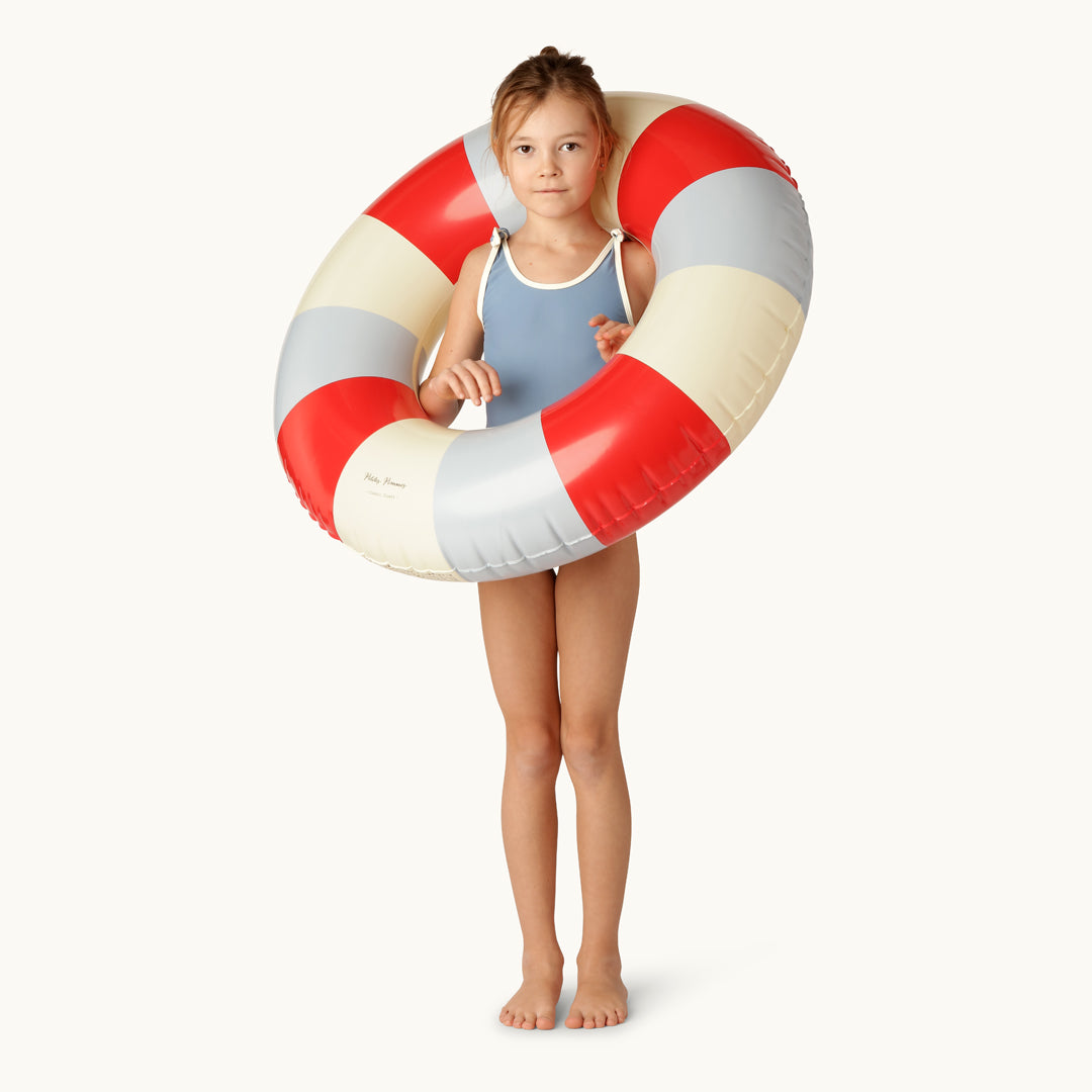 The cream-coloured contrast piping gives this style a timeless look that goes perfectly with our classic floats. Attached knot-bows on the shoulders adds a subtle feminine touch. Match with a tone-in-tone swim ring and swim goggles or mix your favourite colours for a beautiful complete look.