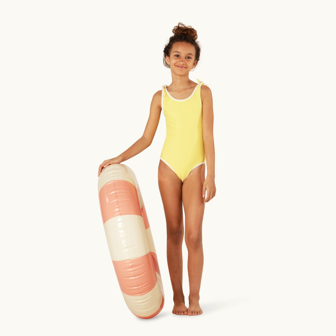 The cream-coloured contrast piping gives this style a timeless look that goes perfectly with our classic floats. Attached knot-bows on the shoulders adds a subtle feminine touch. Match with a tone-in-tone swim ring and swim goggles or mix your favourite colours for a beautiful complete look.