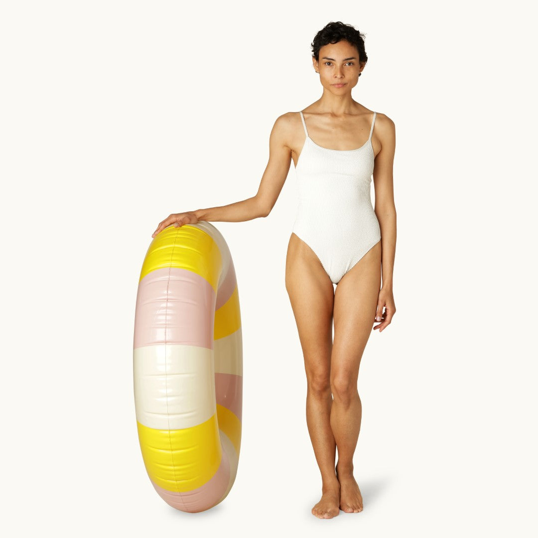 The Petites Pommes swim ring is a reborn childhood classic - made with the attention to detail we have strived to make it last for seasons. Our characteristic striped floats come in different sizes for toddler to adult, and in a range of beautiful colours to complete any summer look!