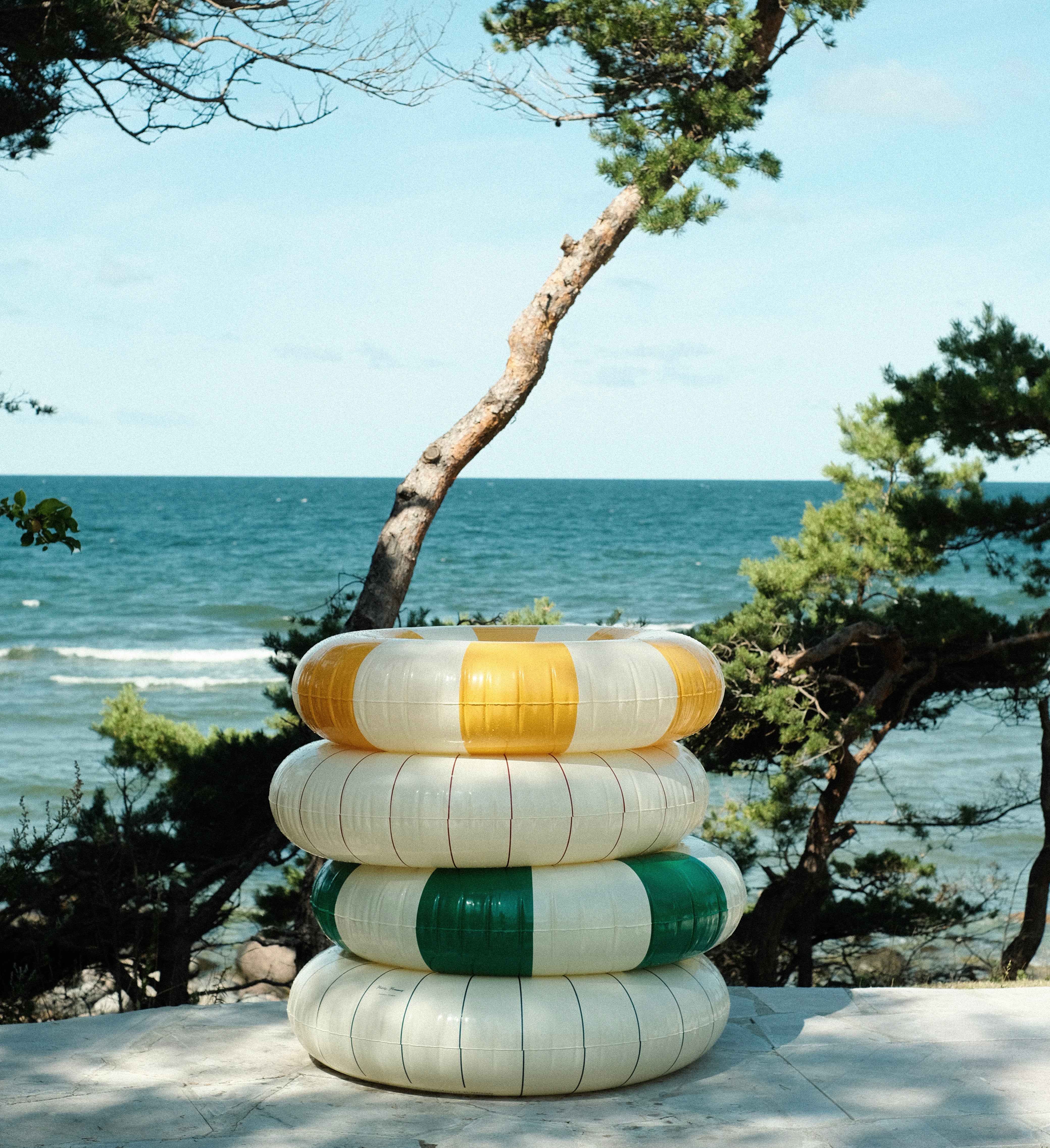 The Petites Pommes swim ring is a reborn childhood classic - made with the attention to detail we have strived to make it last for seasons. Our characteristic striped floats come in 4 different sizes for toddler to adult, and in a range of beautiful colours to complete any summer look!