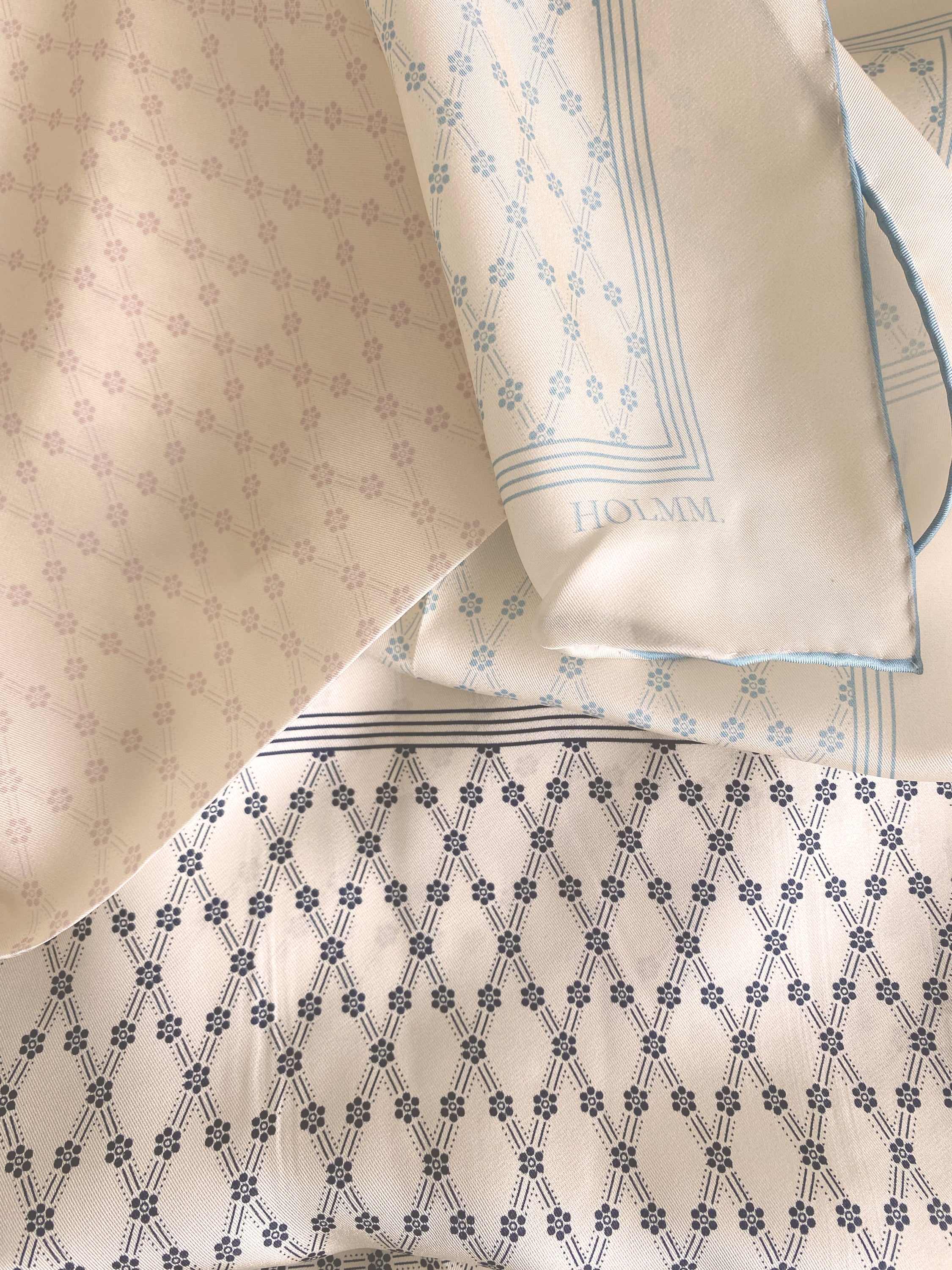 Crafted from a 100% silk twill woven fabric, this square scarf is embellished with HOLMMs exclusive printed artwork which adds a graphic edge to this accessory. This printed silk square scarf incorporates HOLMMs logo branding and is finished with a hand sewn edge.